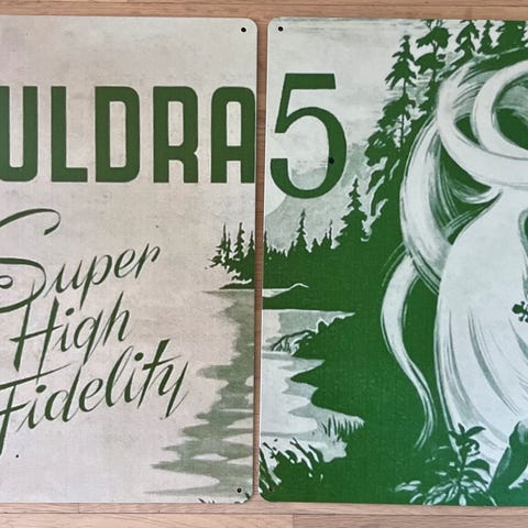 Skilt i metall med reklame for Tandberg Sølvsuper Jubileumsmodell