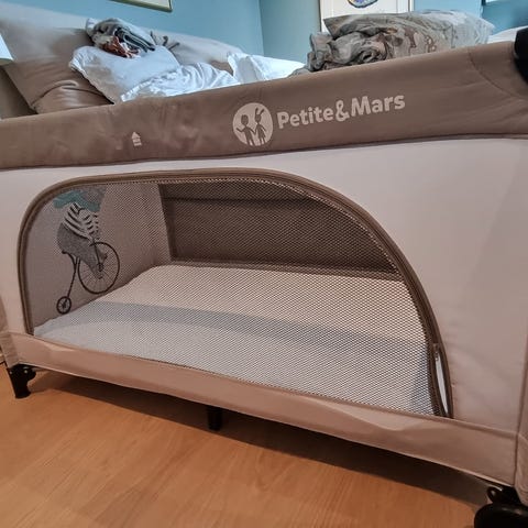 Petite&Mars Reiseseng med mål 120x60 cm i grå farge. Laget for barn med maksimal høyde på 86 cm og vekt opp til 15 kg. Reisevennlig, sammenleggbar design for enkel transport og oppbevaring.