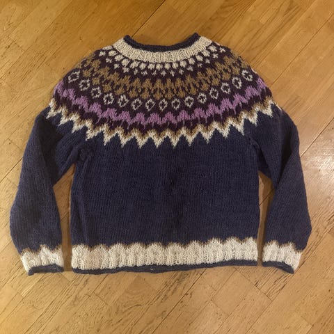 Veldig glad i å strikke, så denne er for fin til å bli liggende i skuffen. Strikket av meg i garnet Alafosslopi. Meget varmt garn fra Island.