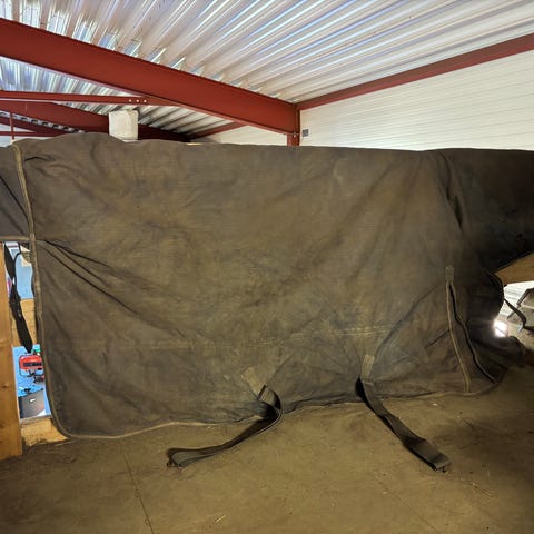 Det er svart og laget av slitesterkt materiale. Designet for å beskytte hesten mot vær og vind.