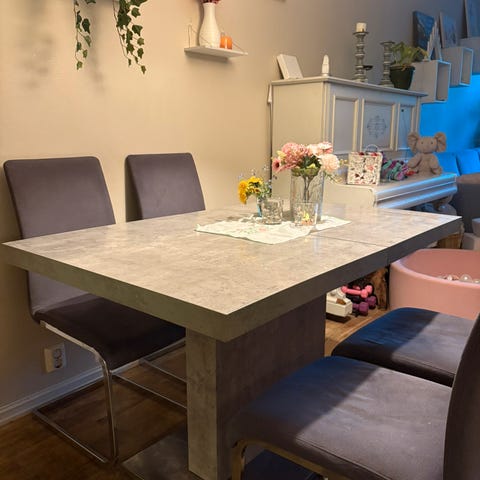 Spisebord med oval marmorplate (ikke ekte marmor) og svart metallunderstell. Bordet har en forlengelsesfunksjon som gjør det mulig å øke lengden. Jeg har ikke illeggsplatene da jeg synes den var stor nok til oss. Passer for spisestue.