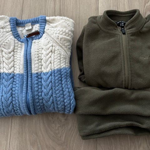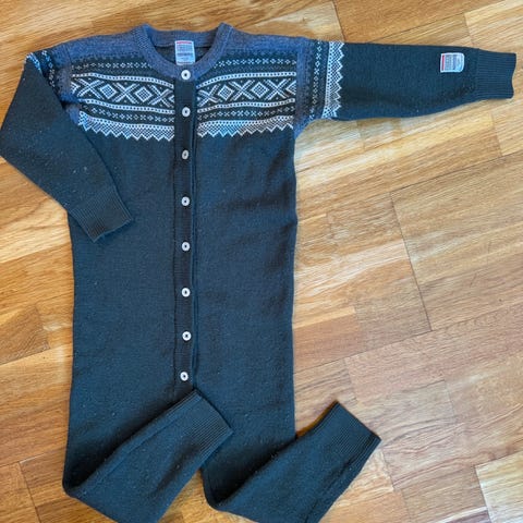 Ulldress fra Reima, str 98. Mariussokker, litt slitt, men ikke hull. Ull-lue fra Pierre-Robert, noen små hull. Nye tykke ullsokker fra Bruse. Nye tynne ullvotter fra Bruse.