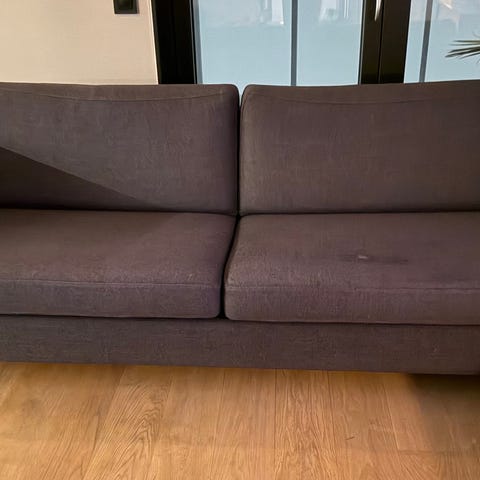 3-seters sofa fra Slettvoll gis bort. Fargen er gråsort. Alle puter har glidelås som gjør rengjøring enkelt. Bena er i heltre mørkbeiset eik. Første bilde er fra 4. januar i år. Øvrige bilder er fra da jeg kjøpte den. Vil tro at litt banking av puter vil gjøre den tilnærmet like pen.
