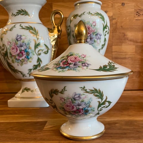 4 asjetter, sukkerbolle/sukkerskål med lokk og te-/kaffekanne med lokk fra tyske Thomas Ivory, Bavaria selges.