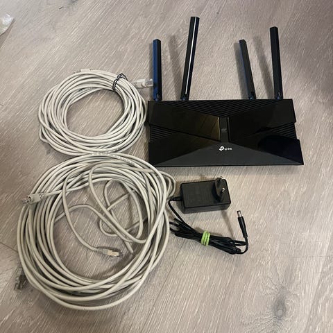 TP-Link Archer C50 AC1200 Wi-Fi Router med dual-band funksjonalitet. Leveres med tre eksterne antenner og kabel for tilkobling. Passer til bruk i hjem eller kontornettverk for trådløs internettforbindelse.