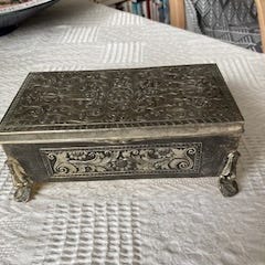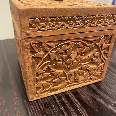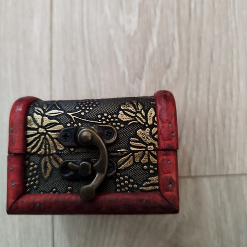 Denne treboksen er en dekorativ oppbevaringskiste, smykkeskrin eller pyntekiste, med et hvelvet lokk og metallbeslag. Den har et rustikk/antikk utseende og er designet for oppbevaring av småting, smykker eller minnesmerker. Håndlaget i India. Ca 20 cm lengde.