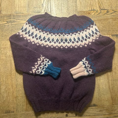Hjemmestrikket ullgenser. Fargen er kremhvit/ ecru. Størrelse er 110-116.