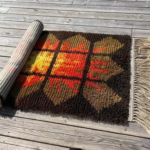 Søkeord: Retro, knyteteppe, knytteteppe, rye, floss, flosseteppe, håndlaget, håndknyttet, Rauma, berber, veggteppe, ullteppe, vintage, Rya, Sellgren, ull
