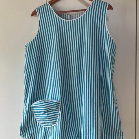 forkle, vintage forkle, eldre forkle, retro, blå bomull, bomullsforkle, brodert, broderi, broderte bånd, rødt, hvitt, grønt, håndarbeid, tekstil, tradisjonelt, 50-tallet, husmor, blåtøy, kjøkken, gjenbruk, omsøm, redesign, forklær