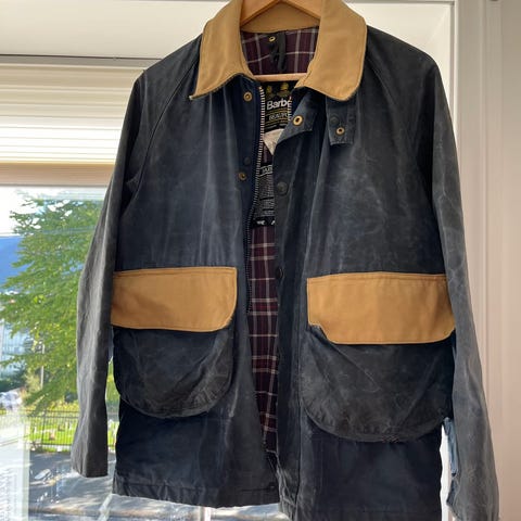 Jakke som jeg har hatt ei stund og som har fått en veldig fin patina med årene. Ikke brukt kjempemye, men har allikevel brukt den nok til at den har fått hull/slitasje på foret nederst på ermene (se bilder). Utover det er jakka i fin stand.