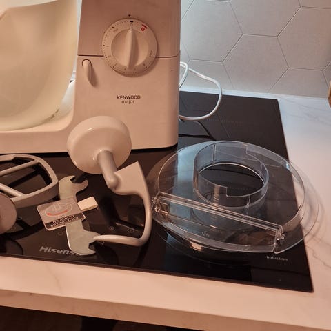 Kenwood PRO 1500 kjøkkenmaskin i hvit farge med tilbehør for ulike matlagingsoppgaver. Maskinen har en kraftig motor og leveres med deler som , eltekroker og kjøttkvern, egnet for allsidig bruk på kjøkkenet.