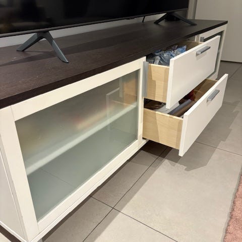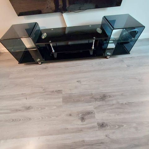 Stilig svart benk med glassplate. 3 dører hvor en er av glass. Kom gjerne med bud.