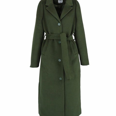 Fin Careless kåpe. lang. størrelse XL for dame. Jakken er beige og laget av ullmateriale. Den har belte i livet og knapper foran.