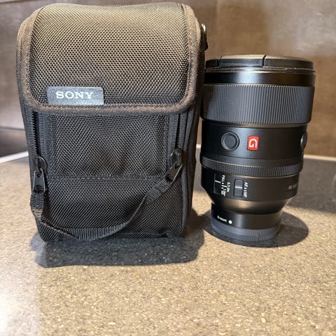 Sony FE 135mm F1.8 GM objektiv i meget god stand selges i original eske og med originalt tilbehør; etui med bærerem, dokumentasjon, solblender og linsedeksel.