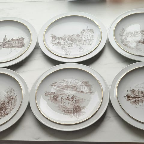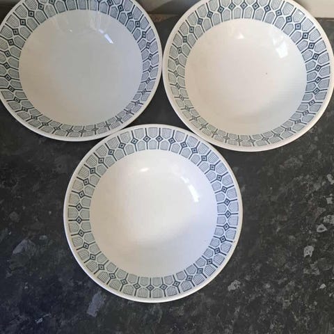 Seks suppeskåler til serviset Allergro fra Figgjo Flint. Antatt produksjonstid 1965-1970.