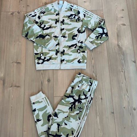 En ny Adidas tracksuit I beige farge med sorte striper på sider I str 150- 152 selges.