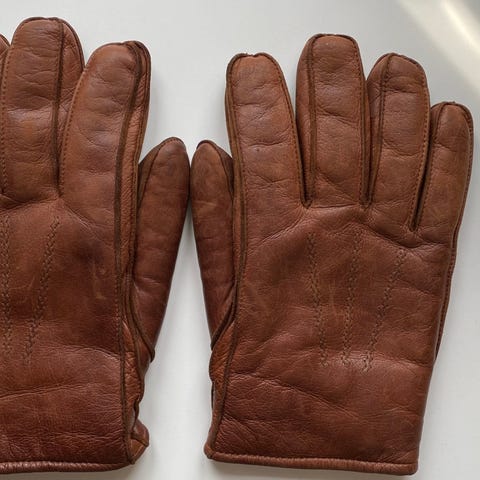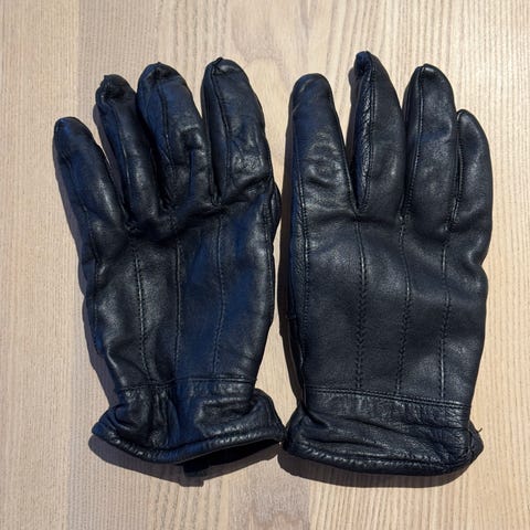 Obs! Hanskene er gamle og ullkledningen nederst på hansken har mistet strikkeffekten (sprø strikk som utvider seg når den tøyes).