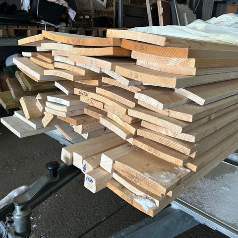 Ukjent merke treplanker i hvit farge. Plankene er stablet og ser ut til å være av standard størrelse for bygnings- eller hobbyformål. Materialet er tre, egnet for ulike konstruksjons- eller reparasjonsprosjekter.