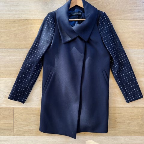 Grå ullkåpe fra Zara i str. M. Kåpen har klassisk design med knapp foran, lommer og splitt bak.