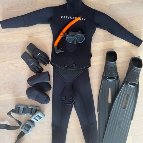 Lite brukt Frivannsliv våtdrakt med votter og sokker. Drakten er laget for bruk i kaldt vann og har forsterkede områder på knær og føtter. Passer for aktiviteter som friddykking og vannsport.