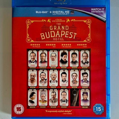 The Grand Budapest Hotel Blu-ray utgave. Inneholder filmen The Grand Budapest Hotel med originalt cover og emballasje. Filmen er tilgjengelig på flere språk med undertekster, inkludert svensk og dansk. Passer for aldersgruppen 12 år og oppover.