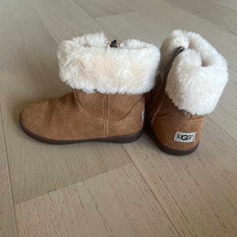 UGG barnesko i størrelse 26, designet for jente. Støvlene har svart farge og er foret med mykt materiale for komfort og varme. De har glidelås på siden for enkel på- og avkledning, og en dekorativ sløyfe bak. Egnet for bruk i kaldt vær.