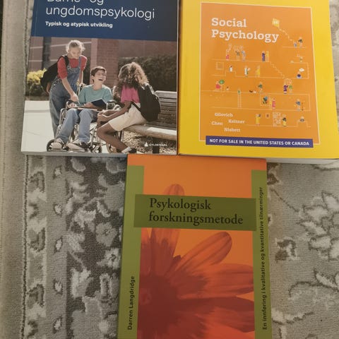 Lærebøker for første semester i psykologi bachelor og årsstudium. Bøkene ble kjøpt helt nye og er kun brukt i ett semester. Ingen av bøkene har markeringer.