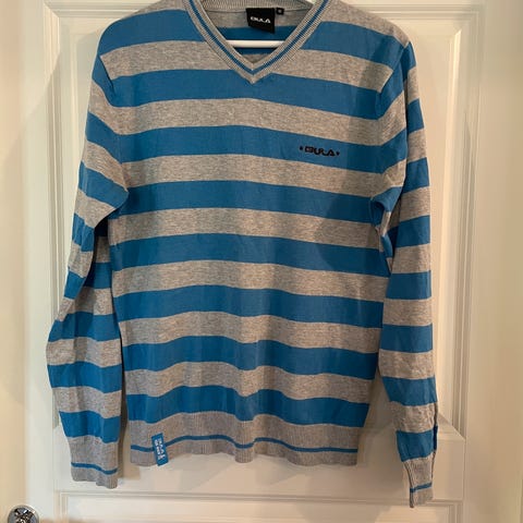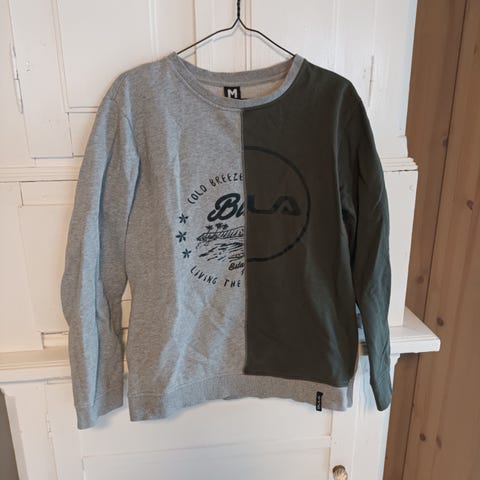 Pent brukt Bula genser. Den er i 80 prosent bomull og 20 prosent polyester.