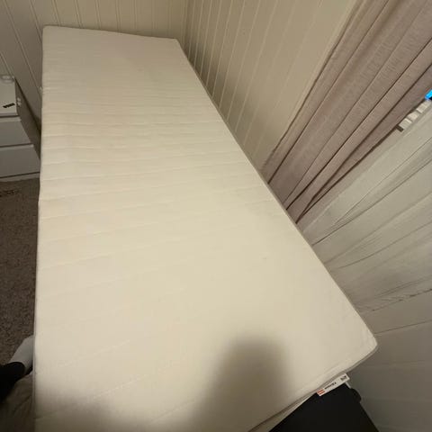 Som ny, er brukt med overmadrass og madrassbeskytter.