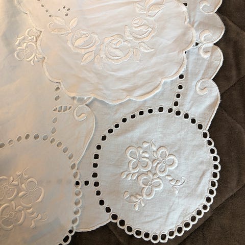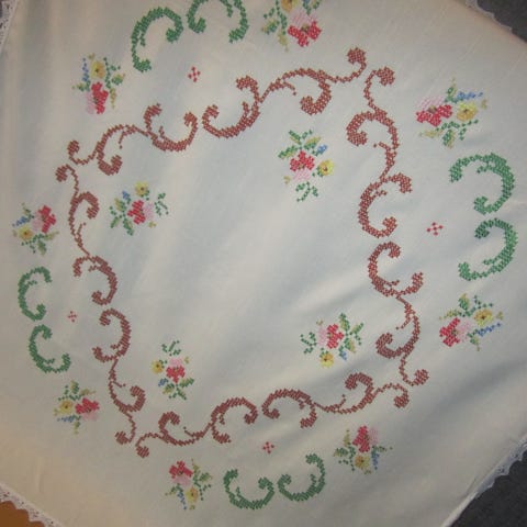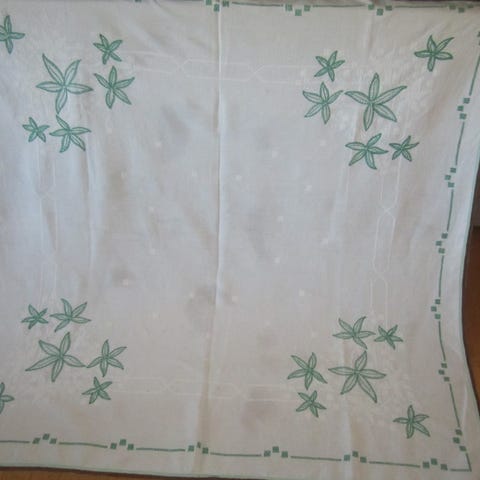 gammel fin duk med håndsydd dekor,og heklekant,mål 108x104cm,samsender,siste bildet baksiden