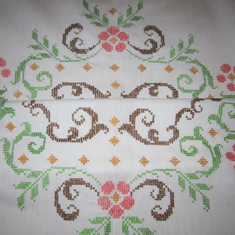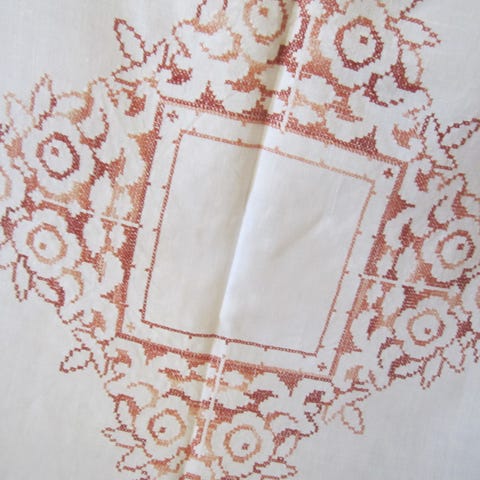 gammel duk med håndsydd dekor på beige/sennep farget bunn