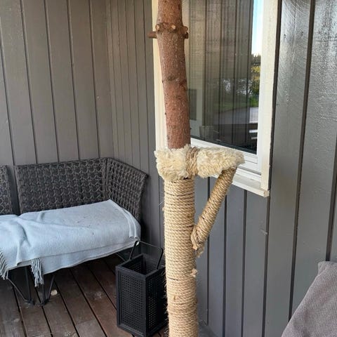 Katt klatrestativ med flere plattformer, sisalstokker og flettet kurv.
