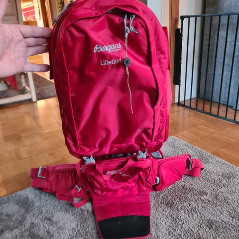 Selger en Bergans Lilletind bæremeis i rød farge. En solid og komfortabel bæremeis med god støtte for både barn og bærer – perfekt til turer i skog og fjell.