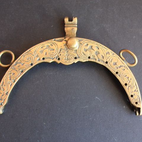 Messing. Kjøpt i Telemark. Har hatt nøkkel men den er borte. 9 cm bred. Selve åpningen er 6,5 x 5,5 cm.