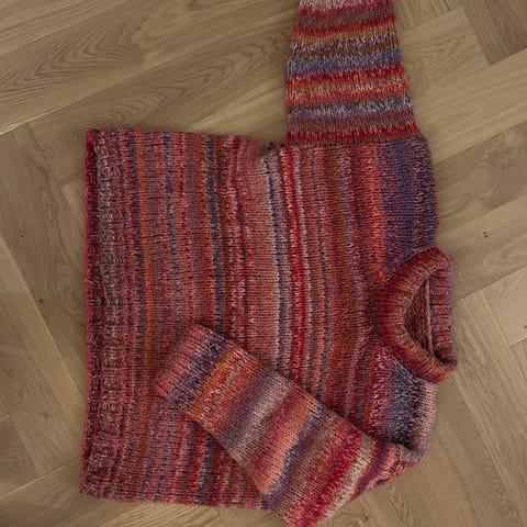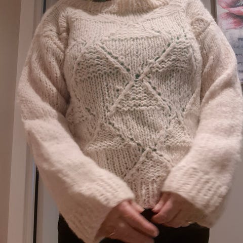 Ny og ubrukt håndstrikket genser i mohair, ull, og silke som gjør plagget lett og luftig. Se siste bilde for nærmere info om garnet.