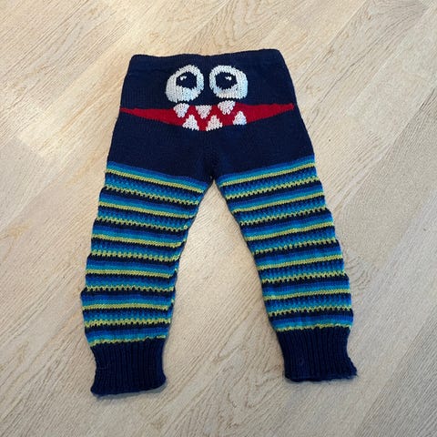 Skikkelig kul og hjemmestrikket monsterbukse selges. Pent brukt. Kan brukes fra 6mnd - 3 år.