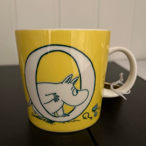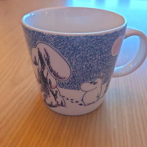 Arabia Moomin kopp med fargerikt motiv av Mummitrollet og venner. Kopp i keramisk materiale, egnet for oppvaskmaskin og mikrobølgeovn.