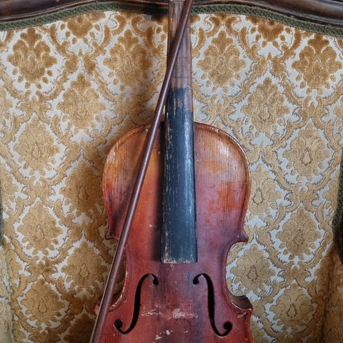 Gammel fiolin, stelt for et par år siden. Buene er litt slitt. Merket er Hopf.