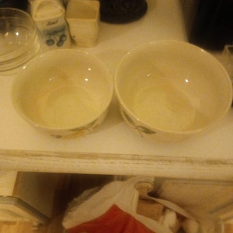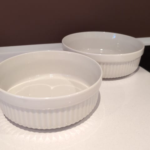 Burka keramikk skåler med tekstene "Chips", "Tomater" og "Jordgubbar". Skålene er hvite med rød og svart tekst, egnet for oppbevaring eller servering av matvarer. 200 pr skål