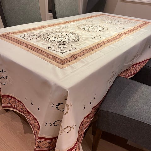 duk med dekor på lys krem/beige bunnfarge,og pyntekant,mål 83x75cm,samsender,siste bildet baksiden