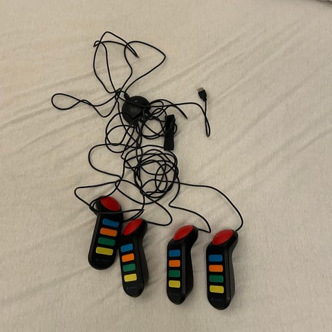 Buzz! PlayStation 2 Buzzers spillkontroller med fire enheter. Hver kontroller har knapper i forskjellige farger og en stor rød knapp. Kontrollerne kobles til PlayStation 2 via kabel. Evt bud.