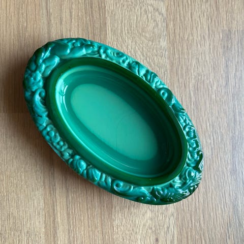 Grønn dekorativ art-deco oval askebeger med detaljert mønster langs kanten. Har en blank finish og er laget av malakitsten og glass materiale. Passer til dekorative formål eller askebeger. Vintage fra 1930 tallet og håndlaget i Czechoslovakia av Hoffmann Curt Schlevogt. Noen små riper og glass som er falt av som er synlig. Nydelig stykke kunst. 13cm.