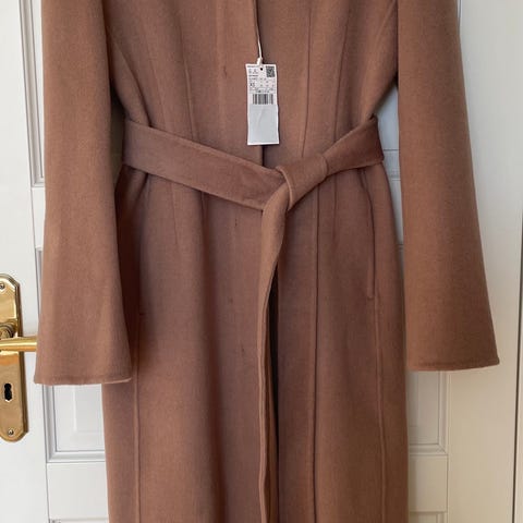 Massimo Dutti kåpe i ull, farge beige/minsk størrelse XS for dame. Plagget er laget av ull og har belte i livet. Designet med lommer og en løs passform. Dette er en veldig romslig og varm kåpe.