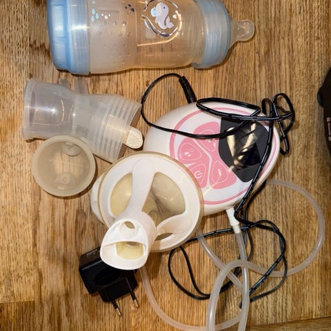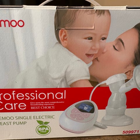 Elektrisk brystpumpe som kan brukes handsfree. Ligger i original eske med lader, bruksanvisning og to brysttrakter (17 og 21mm).