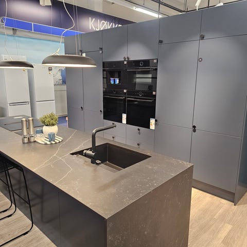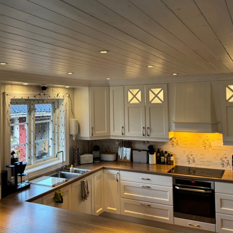 Kjøkkenet er 330cm langt og 210 cm på kortsiden med komfyren. Høyglans hvit med heltre benkeplate av bøk ( hardt treverk uten skader )