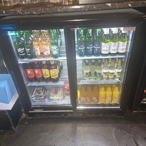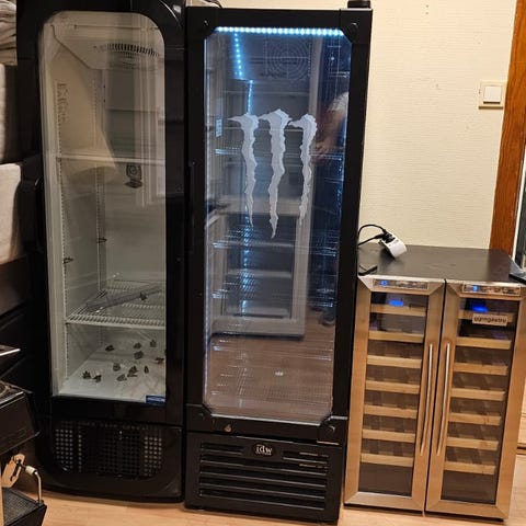 Frigoglass kjøleskap med glassdører og justerbar temperatur. Fungerer som de skal.