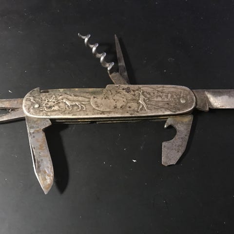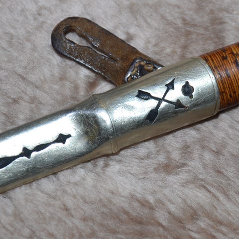 Selger en original og dekorativ antikvitet – metallboks for lommekniver, trolig fra tidlig 1900-tall.