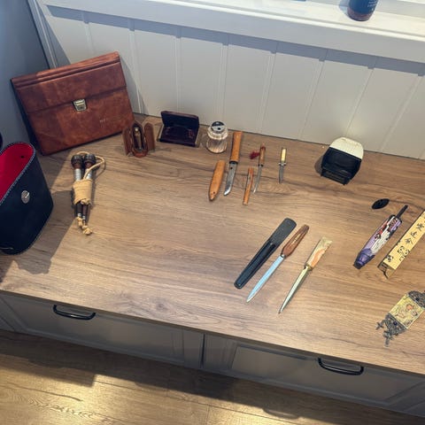 Boksen er grønnlakkert og rikt dekorert med knivmotiv og tekst: