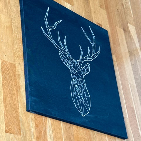 Kunstverk som viser et portrett av en hjort med stort gevir mot en mørk bakgrunn. Bildet har en firkantet form og er egnet for dekorasjon.