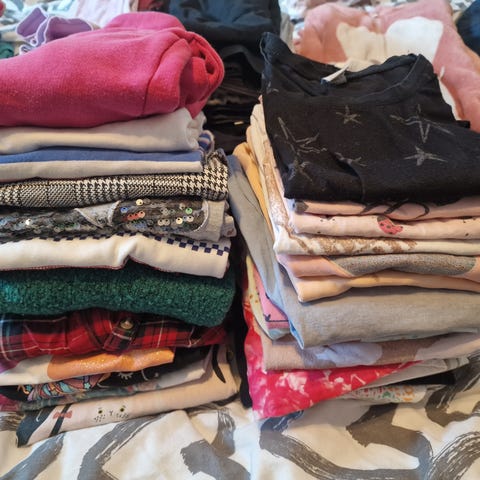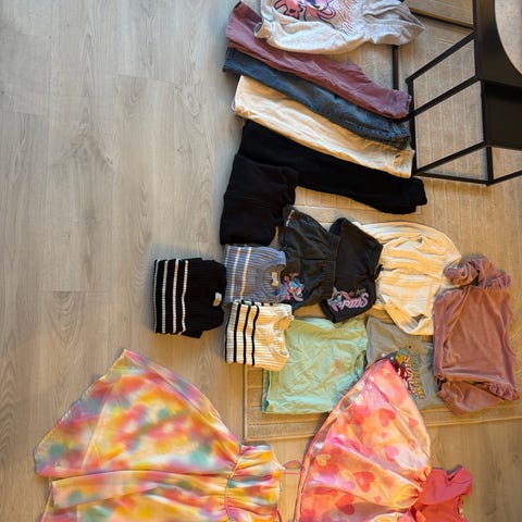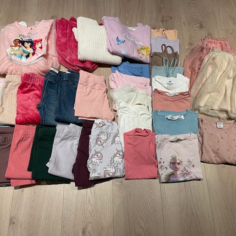 Stor klespakke til jente strl. 122/128. De fleste klærne er uten anmerkninger, men noen av plaggene har små flekker. Se bilder.